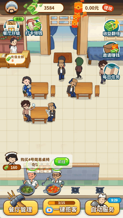 开心饭店红包版是一款融合了模拟经营与红包奖励机制的休闲益智类手游,玩家在游戏中扮演饭店老板,通过经营策略逐步扩大店铺规模,打造属于自己的餐饮帝国,游戏中可获得红包奖励,感兴趣的玩家快来下载吧。