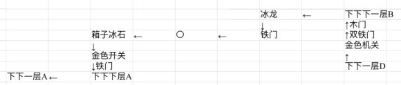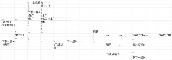 打开控制浮动移动平台A的开关以后,返回原路,前往“下一层B”,然后进入下一层B,按照如图所示的路线,先往左走,然后途中往上走,从墙壁夹住的两扇木门向上,再向右,再向上,依次开启两个机关,打开铁门,前往下下一层B,然后前往后再往上走,直到开启金色机关,随后用翅膀回城卷卖掉捡的东西,再前往下一层C: