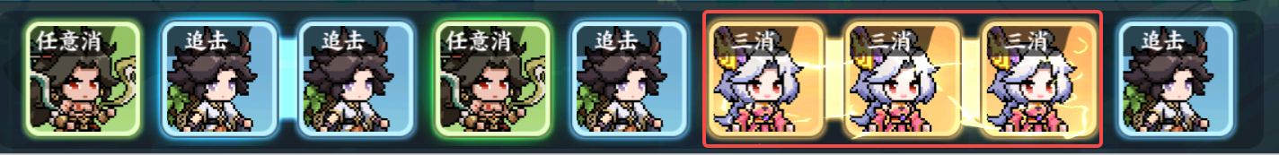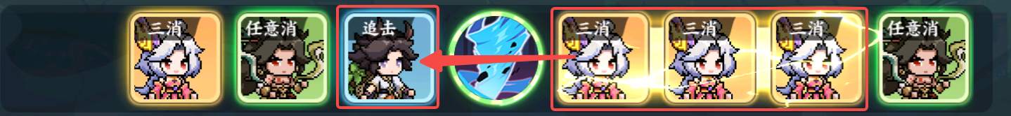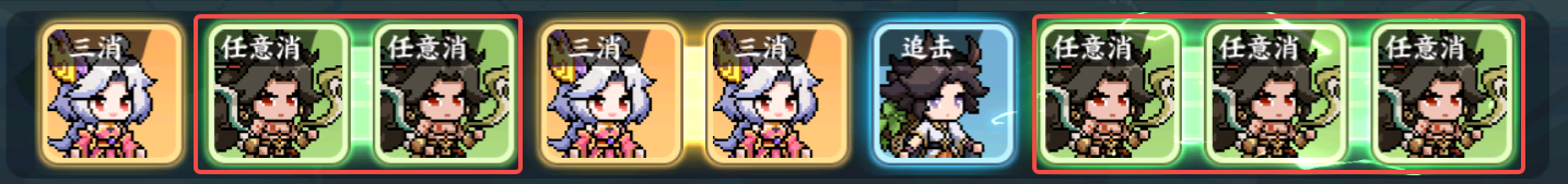 四、追击类的英雄,在战斗中的最强技能效果往往需要依赖其他队友的消块(大多是三消)来触发,推荐在释放了三消英雄的大招后立刻点击追击英雄的角色方块(一个也能点,方块越多效果越好~)