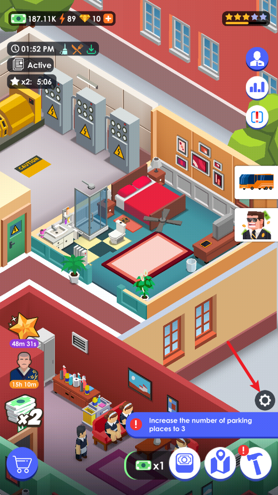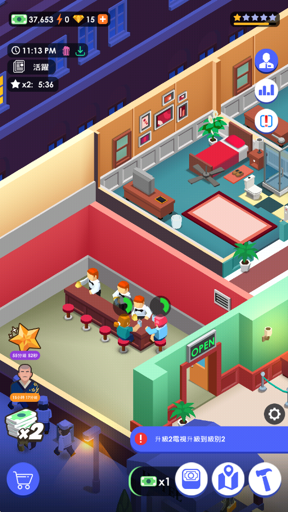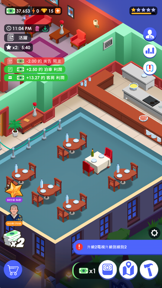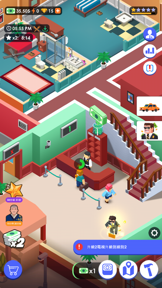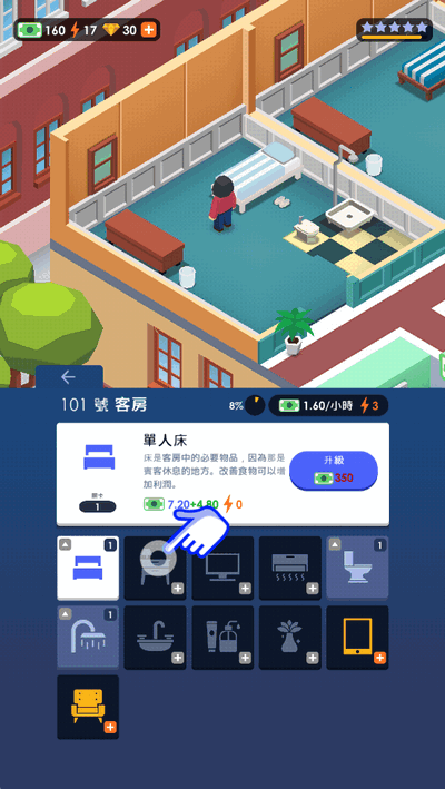 3、通过升级解锁房间内的设施,可以提高整体的收入。