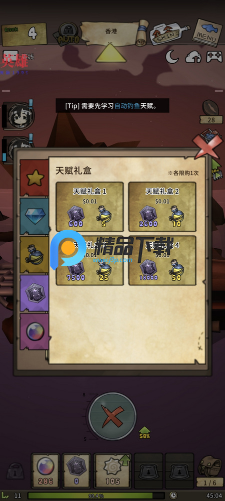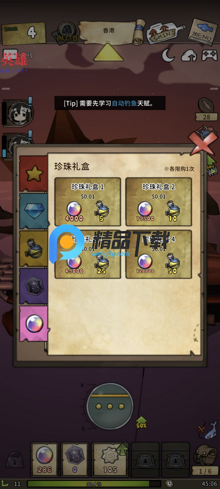 Auto:地图旁的Auto当你在天赋里升级自动导航技能就能解锁,后期放置获得珍珠天赋的必要途径。左下角的Auto是升满自动钓鱼后解锁的按钮