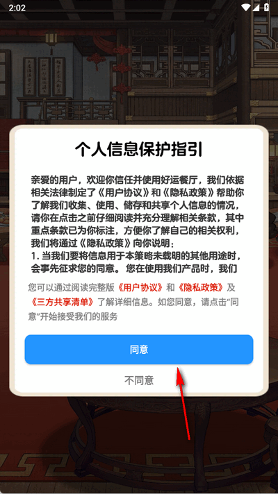 1、打开游戏,同意用户协议