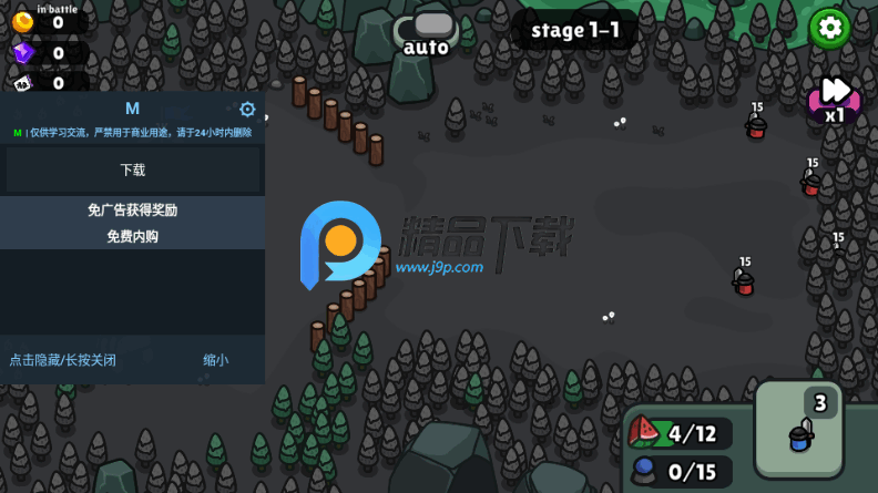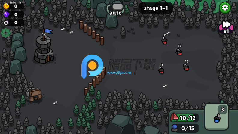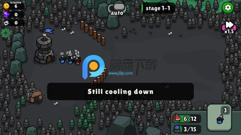 塔防玩法:保卫左侧的塔,抵御从右侧袭来的怪物。