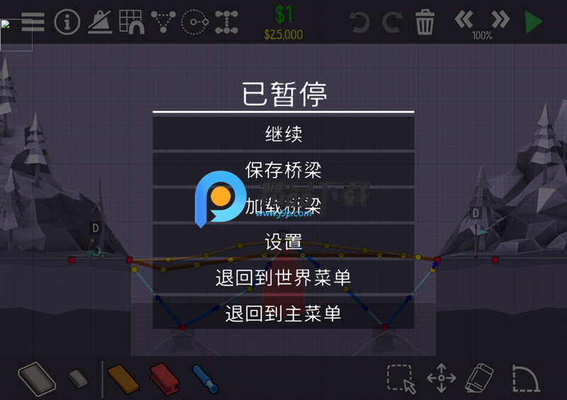 游戏中要注意,搭桥所用的材料,只有从白色的锚点处开始搭或结束,桥才牢固;其他没有白色锚点的区域,不管使用什么修建材料,都是搭不稳的。请注意这点。