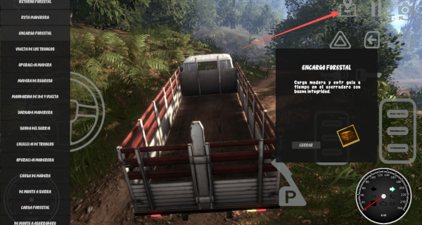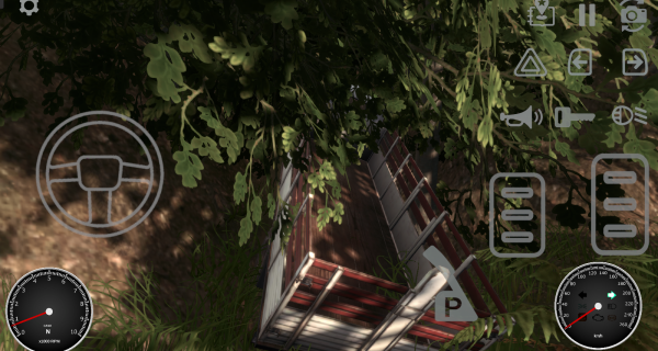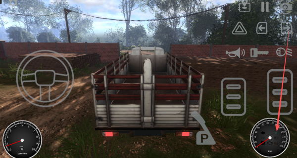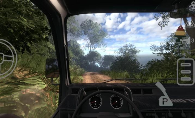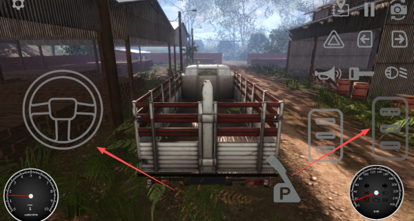 1、滑动方向盘按钮控制卡车的方向,点击右侧的按钮,可以调整行驶的档位或者刹车。