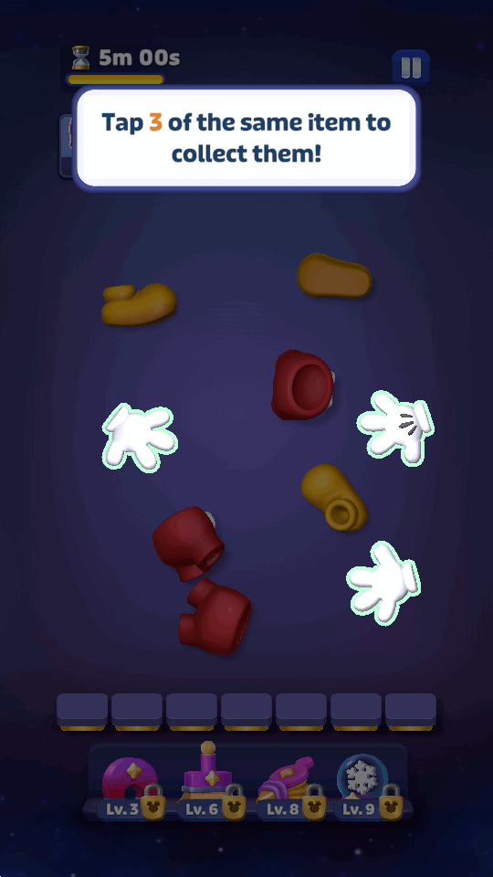 3D物品分类匹配:通过拖拽操作将场景中散落的3D物品归入对应类别格,3个及以上同主题物品完成归类即可消除。例如将“米奇手套、米妮蝴蝶结、唐老鸭帽子”归入“经典角色”格触发消除,特殊类别(如“魔法道具”)可跨主题联动消除。部分关卡含动态障碍物,如《加勒比海盗》关卡的“滚动炮弹”需优先整理避免阻碍。