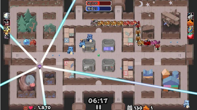 《迷宫鼠》开局可选带基础能力(技能、血量等)、外观不同的老鼠,在地图移动收集可提升等级的蓝色豆子,每升一级触发随机可选元素(如提升速度、攻击方式或防御能力、血量/升级buff),形成每局不同的Build组合。