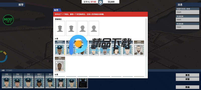 除了表现评极外,警察也有警衔。员工从最低警衔开始,可以提升一条杠、两条杠或三条杠。每周一次,你可以分发条形杠来提升任意员工的警衔。如果某一周人鑜我得没人配得上这份荣耀,你可以推迟仪式。肩章不会给出去,直到你的人做好准备。