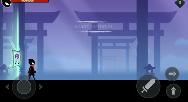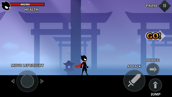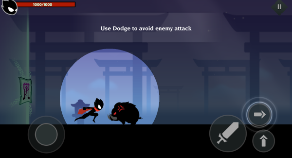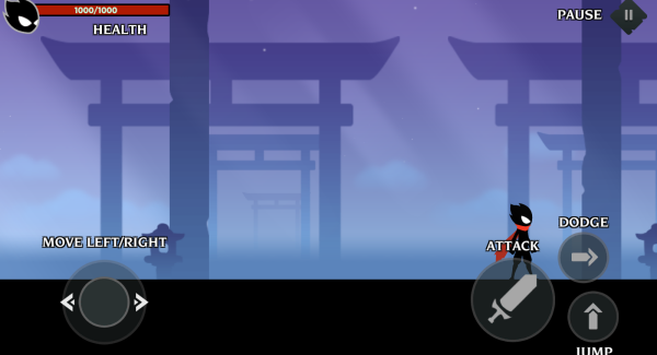 3、游戏内如图,左边控制移动,右边控制攻击、闪避、跳跃;