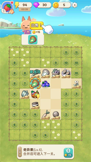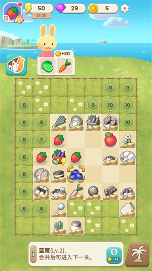 2、点击菜篮子来获得合并素材,将相同的水果或者蔬菜合并来获得更高等级的物品。
