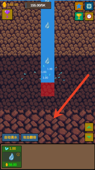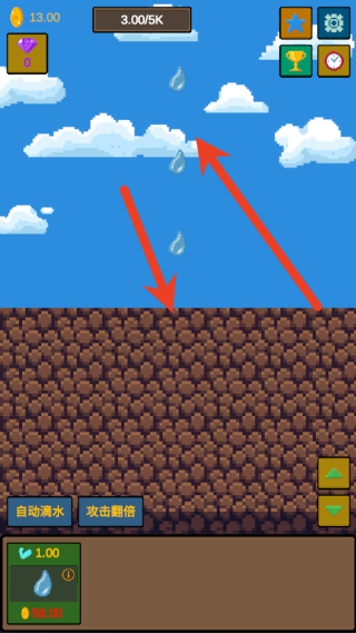 2、持续点击或短暂放置让水滴自动掉落,不断积累金币,然后进入升级界面,使用金币提升水滴的冲击力、掉落频率等属性,以提高每次点击