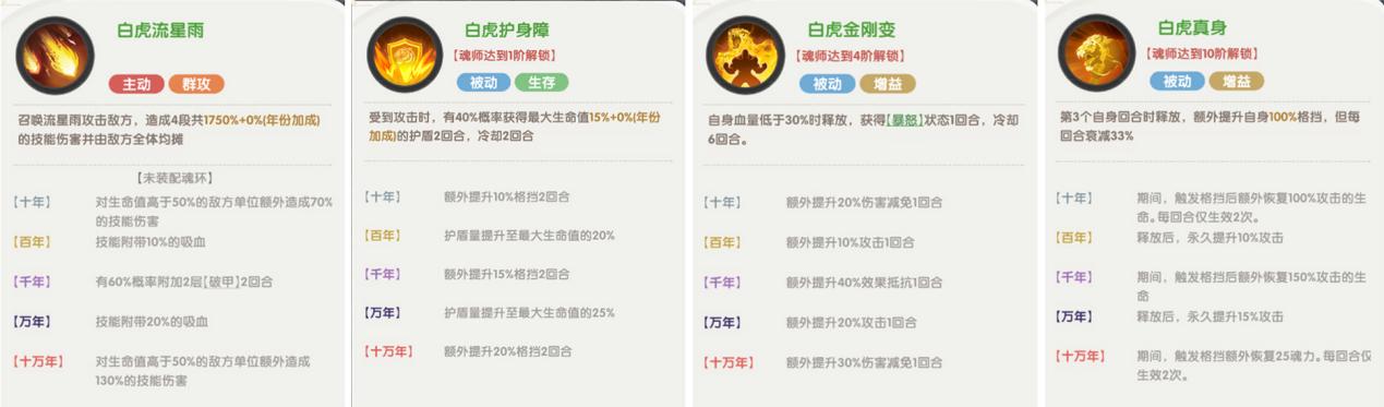 戴沐白作为星罗帝国的二皇子,武魂为邪眸白虎,是一名强攻系魂师。他的技能不仅能对敌方人数最多的一列造成可观物理伤害,还能召唤流星雨随机攻击敌方单位 。【白虎金刚变】,提高自身免伤和攻击力。
