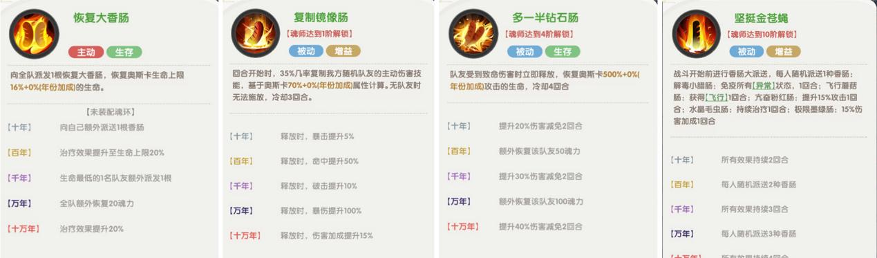 奥斯卡是史莱克七怪中唯一的食物系魂师,他的技能主要用于治疗和提供增益。【恢复香肠】能使友方全体恢复生命值,治疗生命值较低友方魂师时,还能额外增加治疗效果;可使生命值最低的友方魂师恢复大量生命值 。