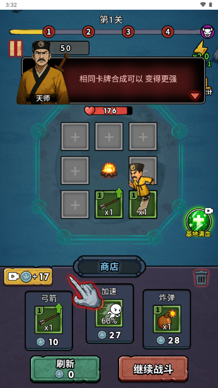 战斗中,玩家需要不断合成更高级的卡牌来对抗怪物