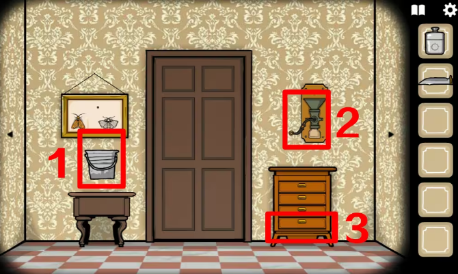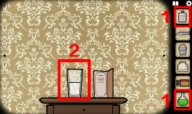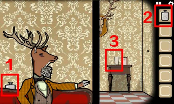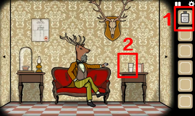 3、乘坐电梯到达一楼,左边的门ROOM1进入鹿先生房间,鹿先生想喝一杯血腥玛丽,桌上写着制作配方,需要血、伏特加、辣椒酱以及秘密成分。在鹿先生身后拿到一瓶伏特加,将它倒入桌上的空杯子里。