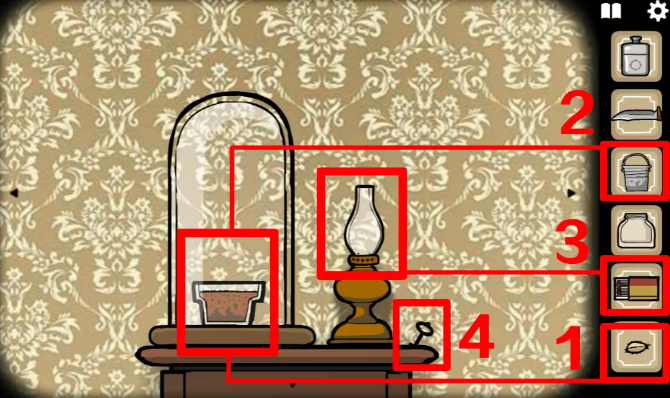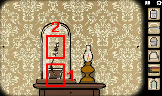 12、鹿先生旁边的玻璃罩中有个花盆,种下种子并给它浇水,用火柴点燃油灯,拾取油灯旁的钥匙。