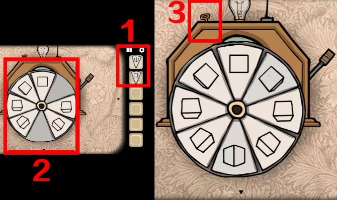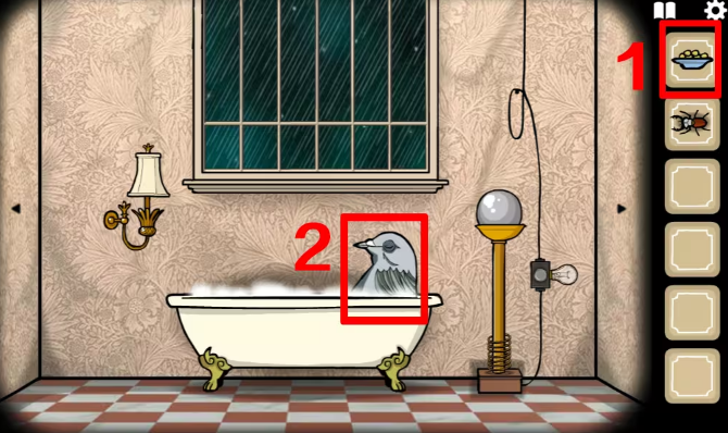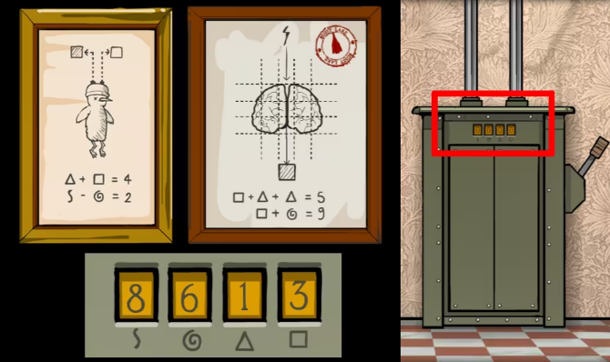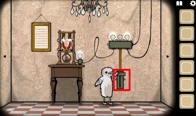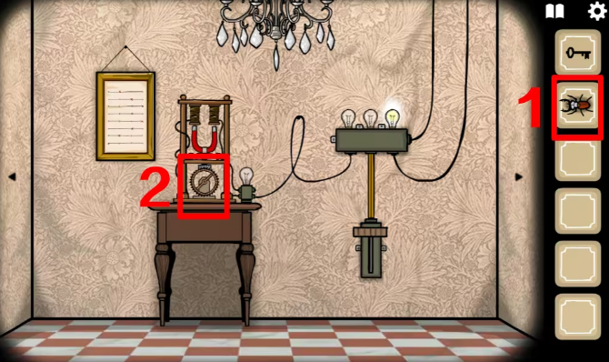 1、坐电梯来到二楼右边ROOM5鸽子夫人的房间,往左切换场景,从右边画框和收音机处拿到两块板,把两块板放入中间有灯泡那个装置里。