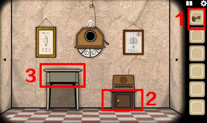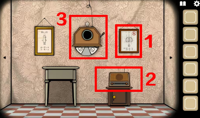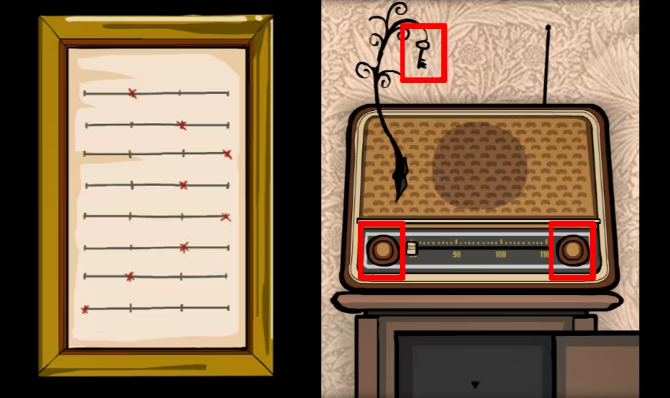 9、接着往右切换,来到有收音机的场景,根据左边画框上的提示旋转收音机的按钮,按照红叉的顺序调整频道,要听到音乐以后再换频道,拿到另一把钥匙。