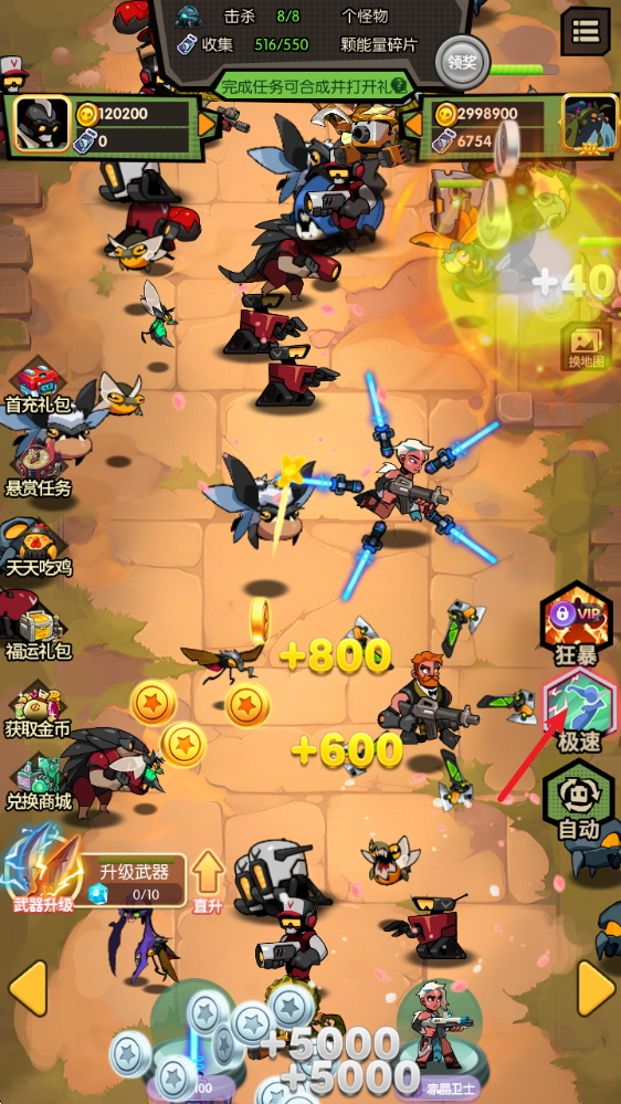 2、右侧还能够开启极速功能,帮助你更快的移动,消灭更多怪物。