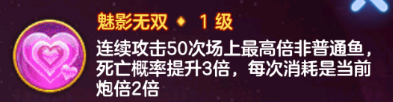 连续攻击50次场上最高倍非普通鱼死亡概率提升3倍,每次消耗是当前炮倍2倍。