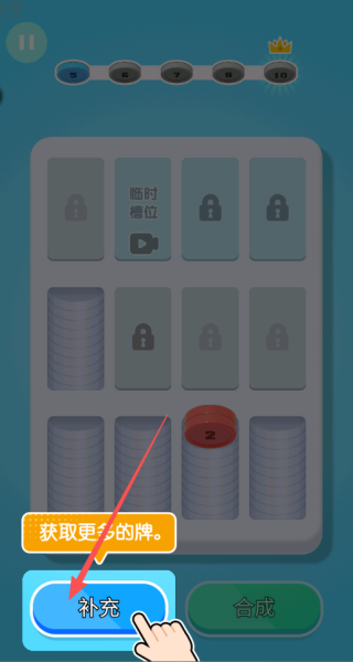 3、当牌列出现空缺或可操作牌不足时,点击补充按钮获取新牌,保证游戏有足够的牌可进行归类与合成操作。