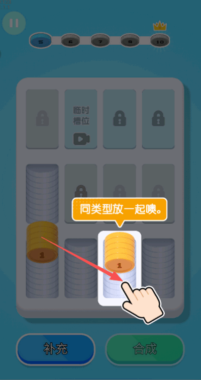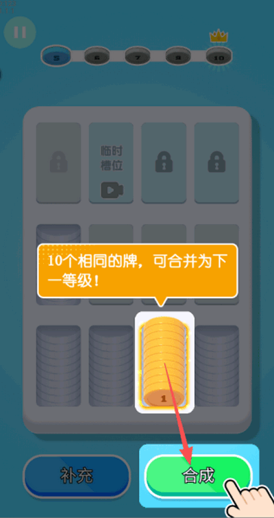 2、当同一列收集到10个相同等级的牌时,点击合成按钮,可将其合并为更高一级的牌。