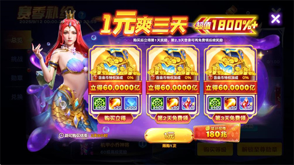 2、1元爽三天,购买后立得第1天奖励,第2、3天登录可再免费领后续奖励