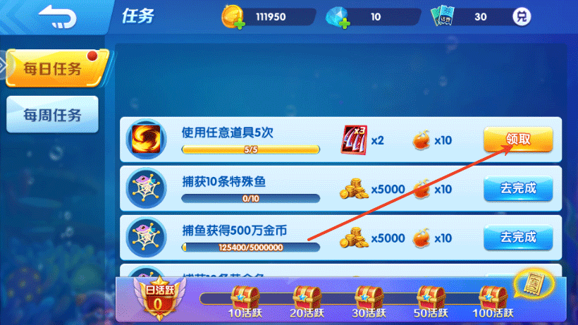 4、捕获积分鱼累积积分到目标数量,即可参与指定宝盆的抽奖