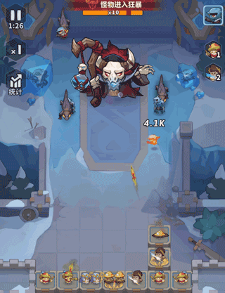 Boss牛魔王会在第4波出现,此时阵容还未真正成型,面对如潮水般涌来的怪物,对阵容单体、群体输出要求较高,需要搭配出远近兼具输出能力的合适阵容。