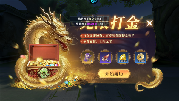 2、创角大礼:登录直送打金券、复活凤羽、1000万金钻及10万铜钱!