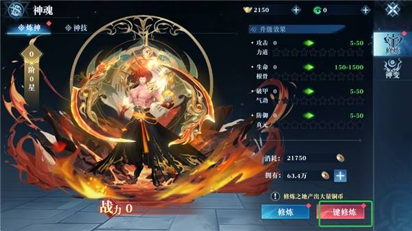 玩家可消耗铜币为神魂进行修炼,攻击、生命、破甲等方面都将得到提升。