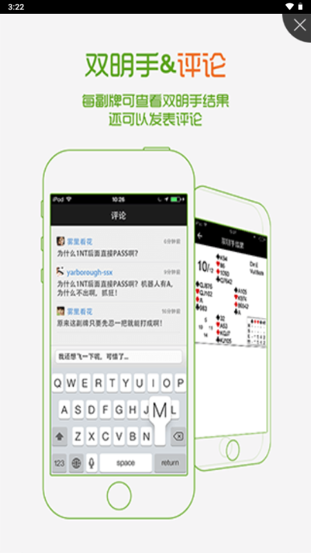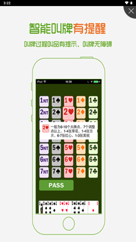 用户在开始打牌后,叫牌界面提供叫牌提示方便用户精准叫牌;打完牌后可回放并且每副牌可重打;每副牌提供双明手结果和发布评论;