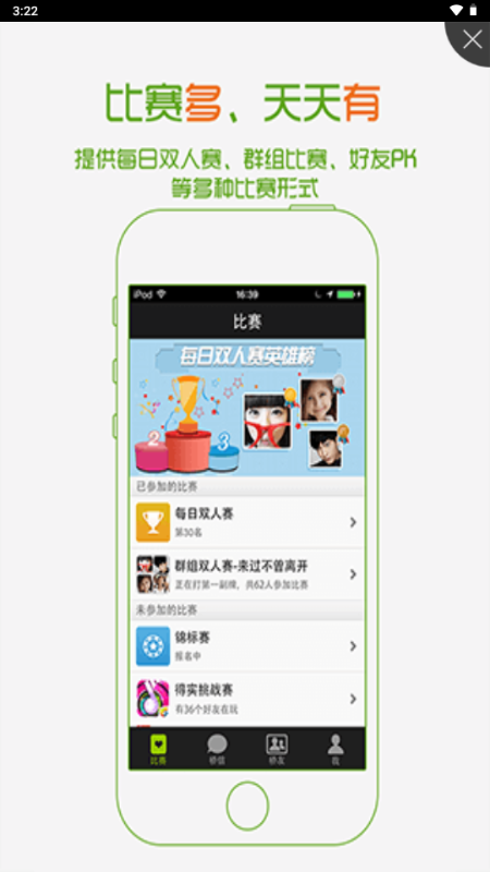 用户可以参加PK竞技场,每日双人赛,群组比赛,好友PK赛,锦标赛等多种比赛。也可以自己发起个人锦标赛、群组比赛、好友PK赛;