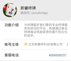 打开微信,在公众号中搜索并关注新睿桥牌的微信公众号“新睿桥牌”,进入本公众账号后,点击公众号下方的“会员中心”菜单,选择“充值桥币”, 通过输入新睿昵称和输入充值金额,在微信里面完成支付就可以为自己的新睿账号进行充值了。详细步骤说明见下方图例。