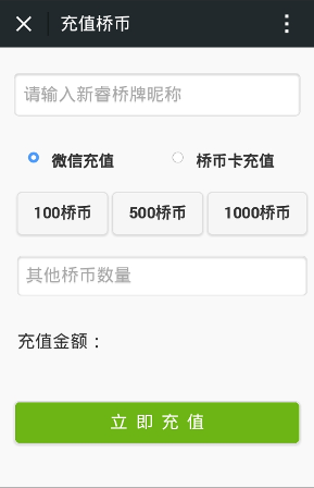(下图:跳转到“充值桥币”页面输入新睿桥牌昵称并选定或输入充值金额)