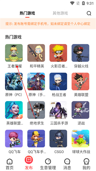 进入发布界面:登录后,点击APP首页的“发布”按钮,选择一款游戏。