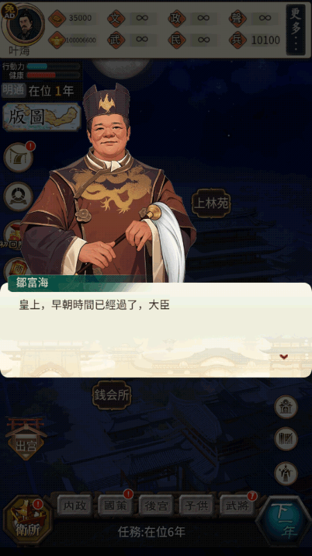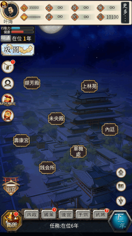 这是一个充满挑战的开始,也是展现您智慧和统治才能的机会。是认真挑战朝政,通过精心策划内政把皇朝问题在这一代解决,留子孙一个更容易的开局,还是微服私访,夜夜瑟瑟,为皇朝生育出一个数值超棒的太子后,退位让贤?你都可以随意尝试!