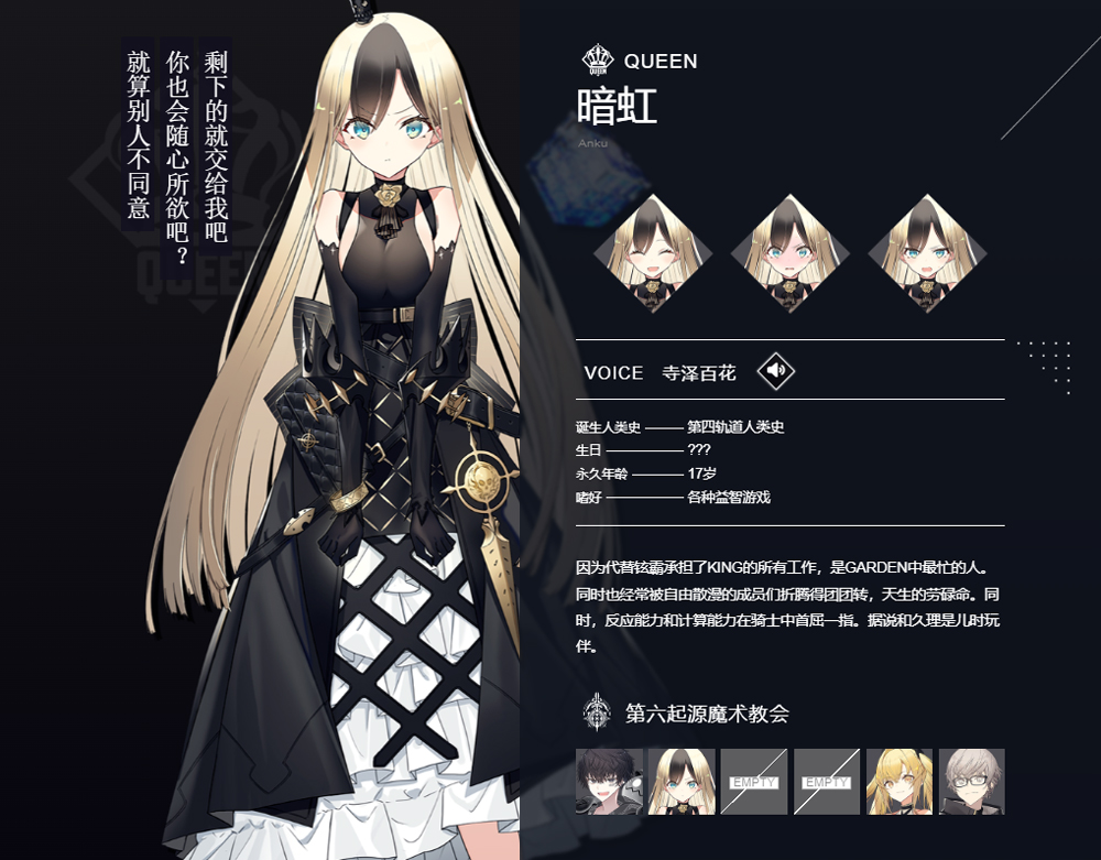 因为代替铉霸承担了KING的所有工作,是GARDEN中最忙的人。同时也经常被自由散漫的成员们折腾得团团转,天生的劳碌命。同时,反应能力和计算能力在骑士中首屈一指。据说和久理是儿时玩伴。