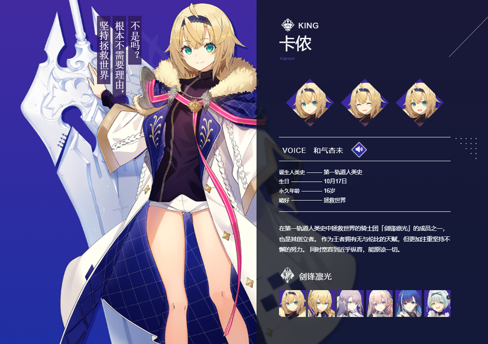 在第一轨道人类史中拯救世界的骑士团「剑锋凛光]的成员之一,也是其创立者。作为王者拥有无与伦比的天赋,但更加注重坚持不懈的努力。同时宽容到近乎纵容,能原谅一切。