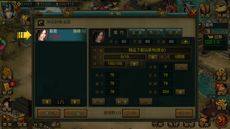 接下来进去就开始招将,因为我们没有金,不可能开区有什么好将,所以就用酒馆的垃圾将了!步最好是智的,没有,其他也将就用着!