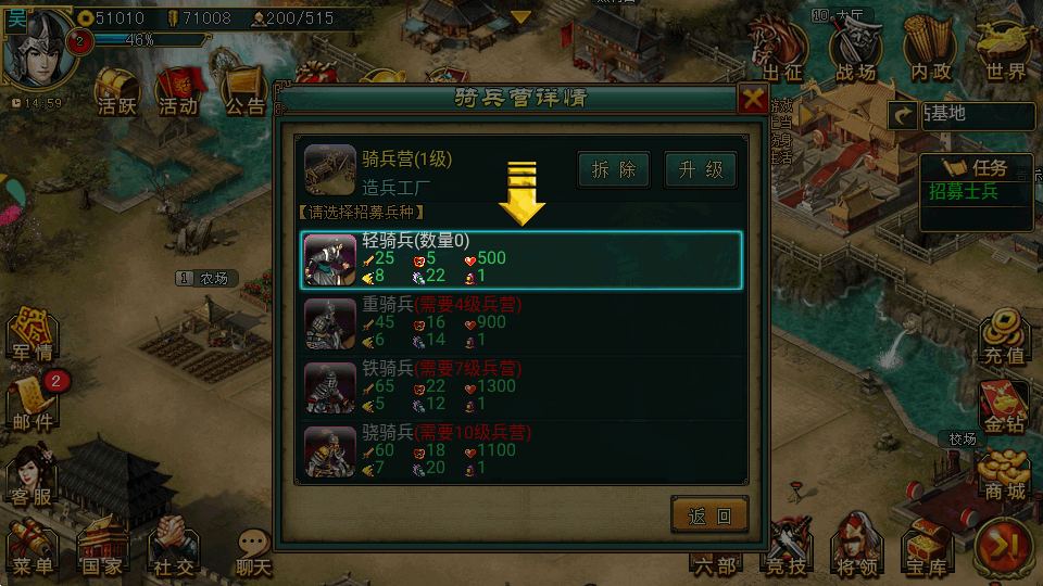 秒了建筑3,我们就步,弓慢慢升,骑营的升级,千万别停,因为我们需要领升级兵营的任务奖励!然后四个车营就开始招小车,有多少人口招多少车!别停!