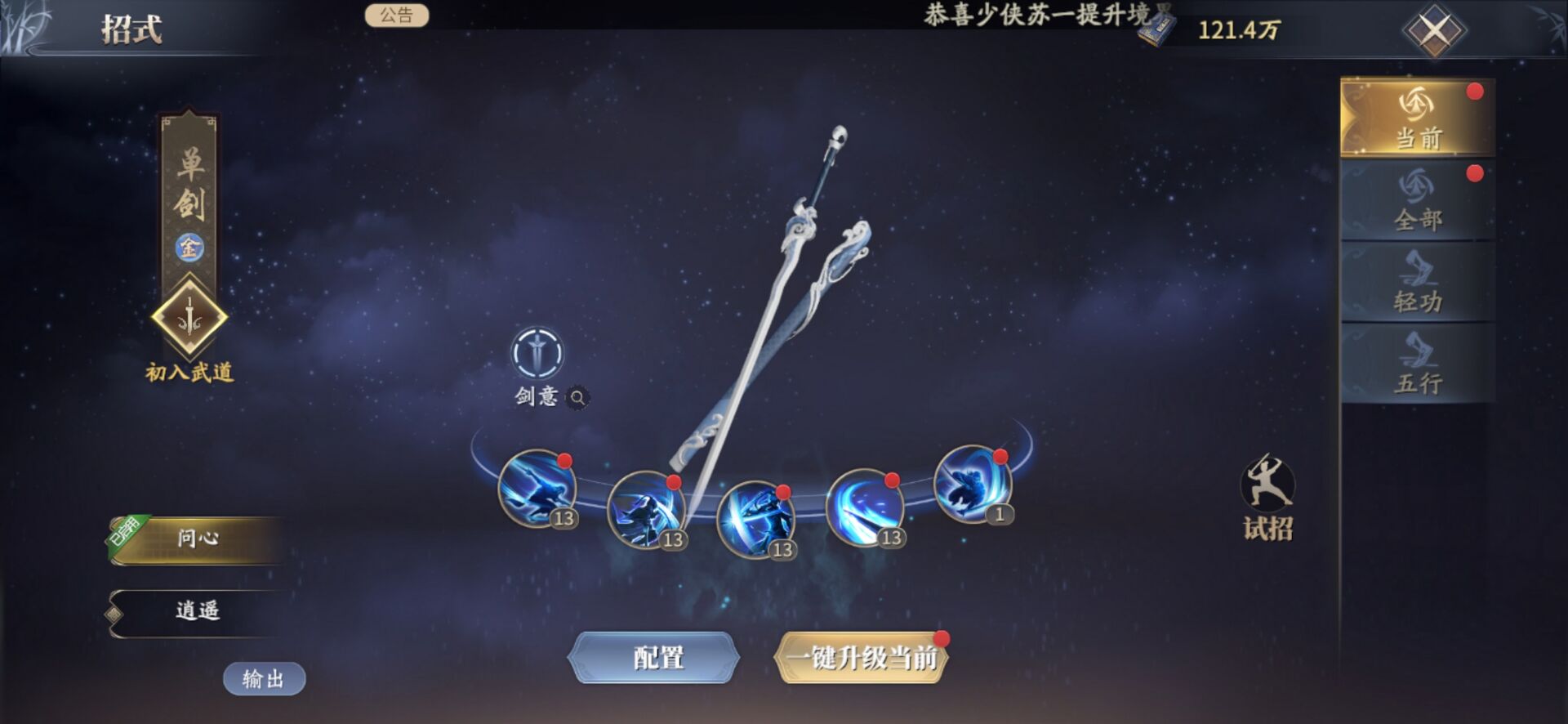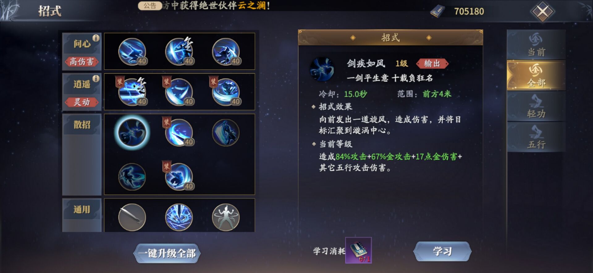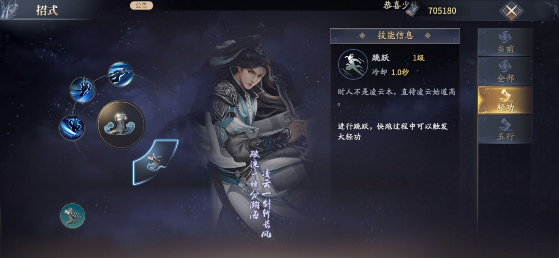 装备技能分为三个剑技能,两个可搭散招,一个被动,及通用技能和轻功。
