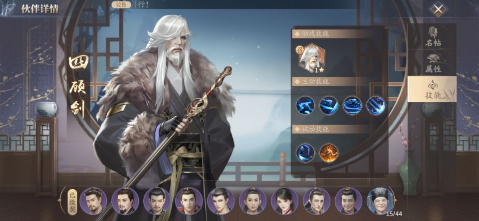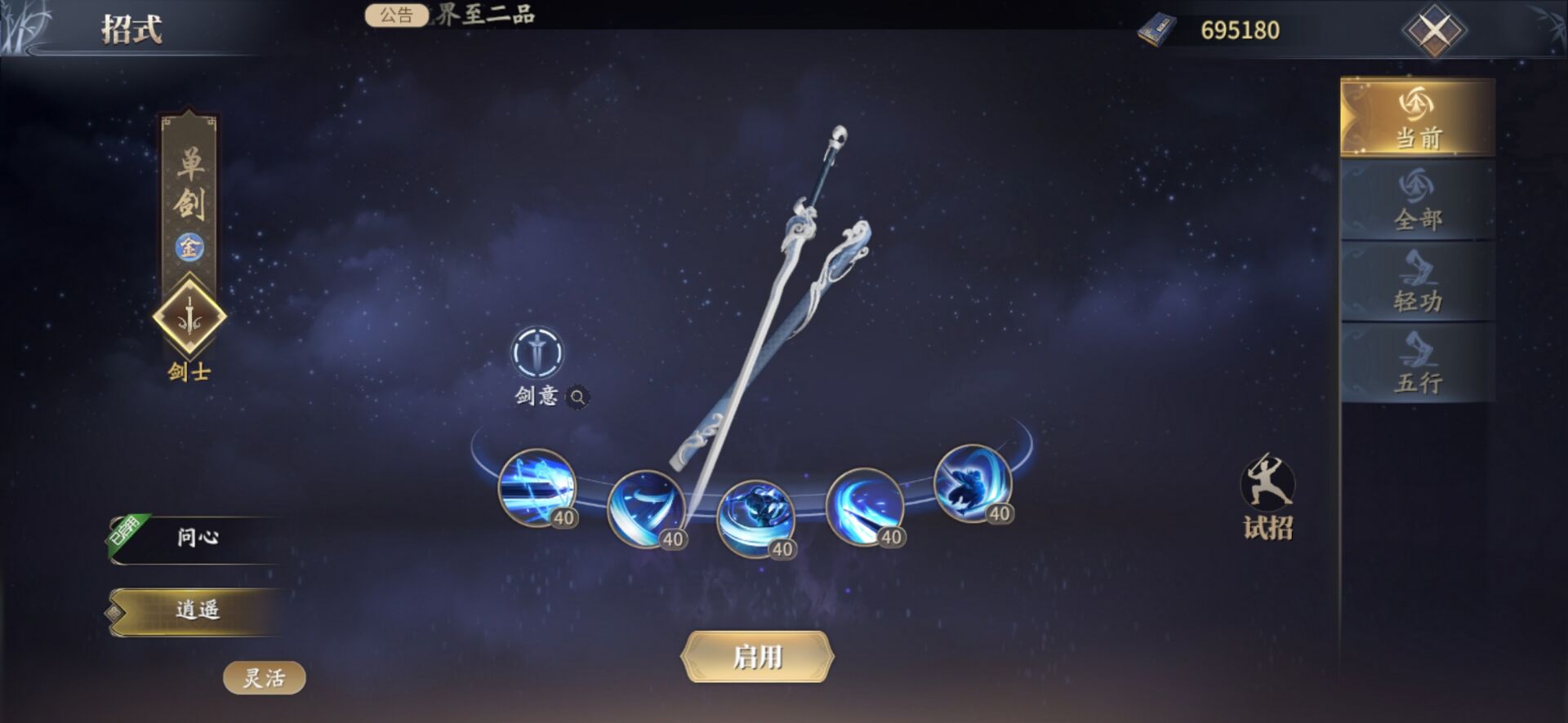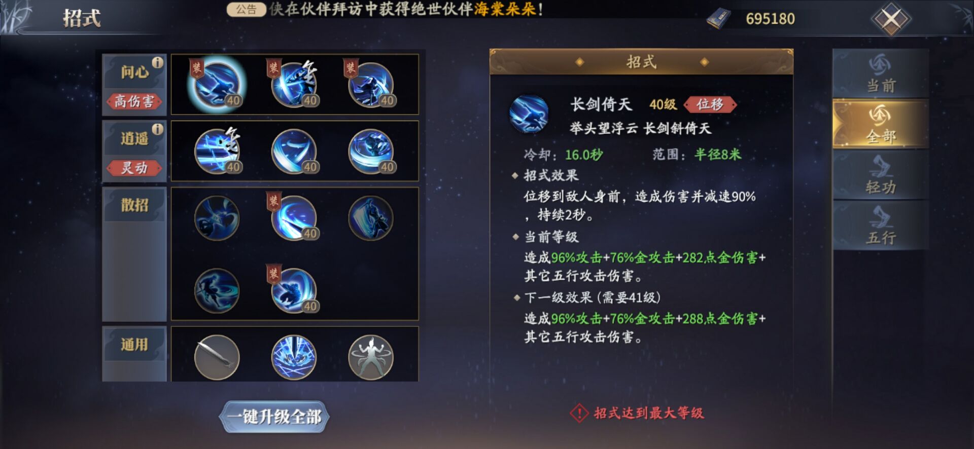 装备技能分为三个剑技能,两个可搭散招,一个被动,及通用技能和轻功。