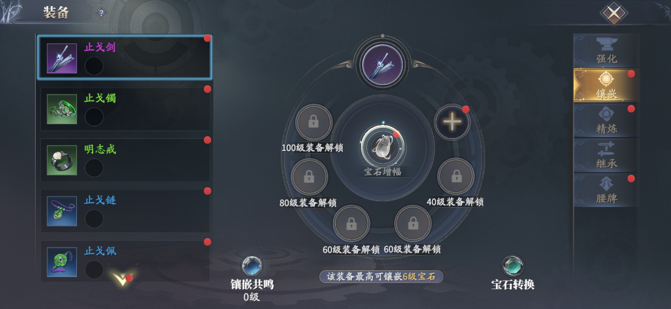 ①镶嵌要吃装备等级,第一件位是无条件开的,剩下的要40,60,60,80,100级才能开启,镶嵌宝石可以大幅度提升属性。
