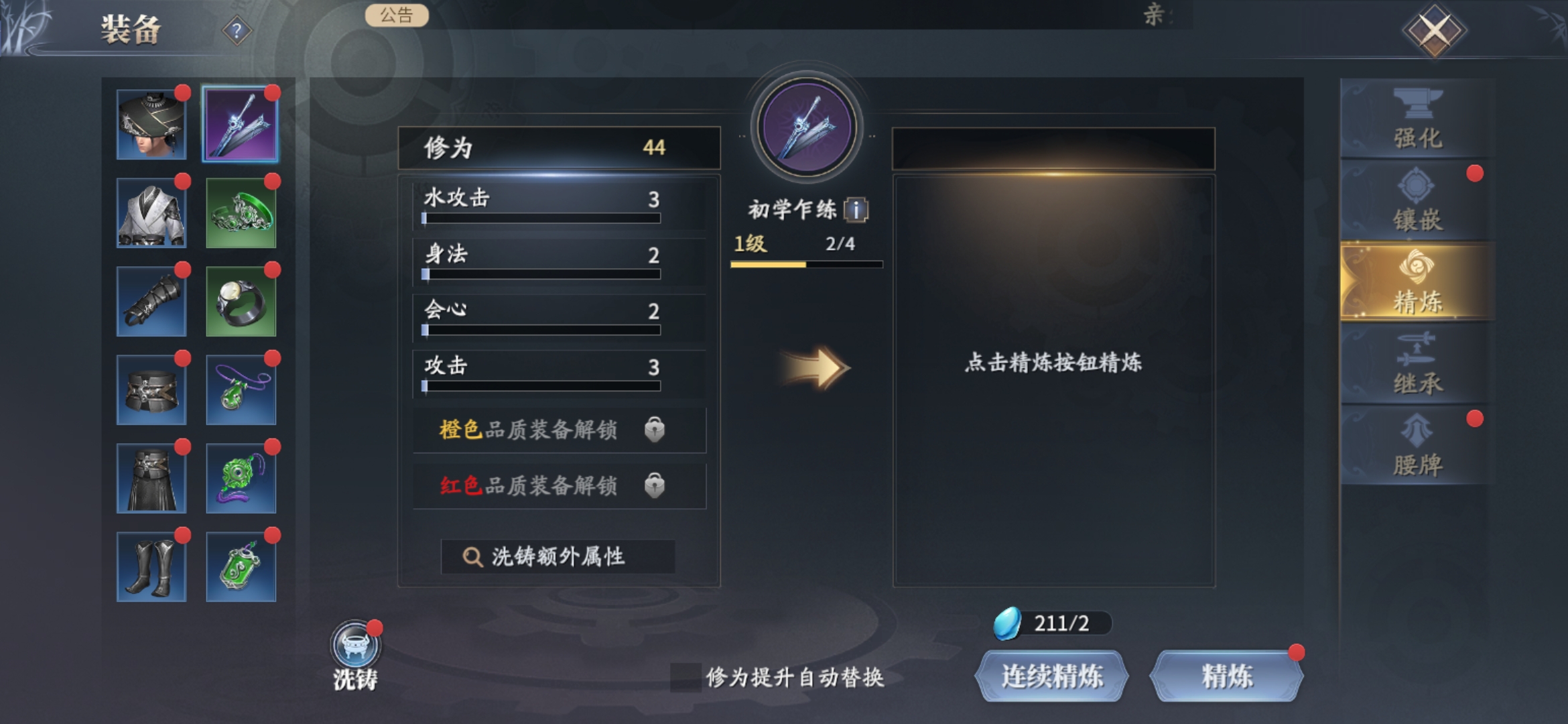 ②精练可以提升精练等级,可见图中间那个进度条,等级越高洗出的属性加成越高。既然是洗炼,自然就是慢功夫了,加成多少是卡在等级上的,等级要次数,越往后次数越多,而且等级不互通,这个后期再慢慢整叭。