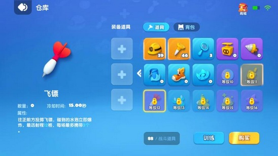 :直线飞出一个飞镖,引爆第一个炸弹,能打对方一个措不及防3.鞋子:能踢飞一个炸弹,可以关键的时候救自己或者压极限时间讲快爆的炸弹踢飞别人(对于控制时间要求较大)4.钉子:陷阱类型,放在地上如果碰到(钉子与炸弹重合)炸弹直接炸开,一般要配合“鞋子”且需要提前设局 5.弹射器:依照你的轮盘方向跳1~4格,跳的格数依照你前面的方块,若没有方块默认跳一格。缺点:现在游戏是四方向盘不是八方向盘无法斜跳(或者说判定比较难)6.隐形炸弹:使用后将下一个炸弹变成隐形炸弹(只有道具“侦查”能看得见爆炸范围)。使用方法:先放一堆炸弹,留一颗,让别人以为你没炸弹了然后走到他躲的位子放一颗隐形炸弹7.手里剑:向前飞出一根手里剑,能远程收割对手8.针:可以自己解除被泡泡包起来的状态(被包起来,一旦被别人碰到或者一定的时间到了,你就会game over)