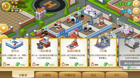 在医院的右侧,可以看到两个小小的建筑物,可以用来研发科技和分配经验,获取的经验是可以用来给医生和护士们升级的,升级医生可以增加工作效率,要注意的是在资金足够时,及时更换综合较高的医生,点击建造好的诊疗室,可以选择更换壁纸、移位以及升级的操作,升级诊室可以增加收费以及提升医术。