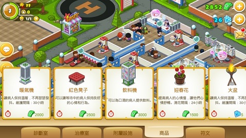 此外,有闲余钻石时可购买代步车,这个可以帮助病人快速抵达要去的科室,通常玩家会将最後的治疗室放在医院两侧,距离较远,此时可以将代步车放在病房和超声波检测室这类大多数病人在倒数第二间行经的科室,让病人尽早离开医院,减少人潮。