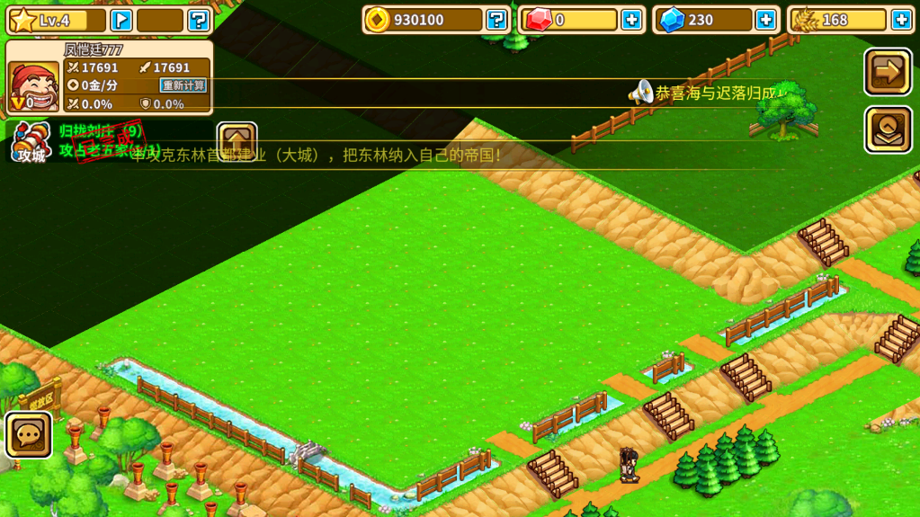 建筑升级是提升资源产出的关键。以农田为例,1级农田每小时生产10单位粮食,升级至2级后产量提升至15单位,但升级需消耗木材与矿石。此外,游戏引入“土地解锁”机制:玩家初始拥有1块32格土地,后续可通过钻石解锁额外土地(共7块),不同土地的地形与资源分布差异显著,例如6号土地(49格)自带2个矿洞与2个树木资源,适合建造资源型村庄;7号土地(17格)地形陡峭,仅适合建造防御工事。这种设计增加了策略深度,玩家需根据发展阶段选择土地解锁顺序。