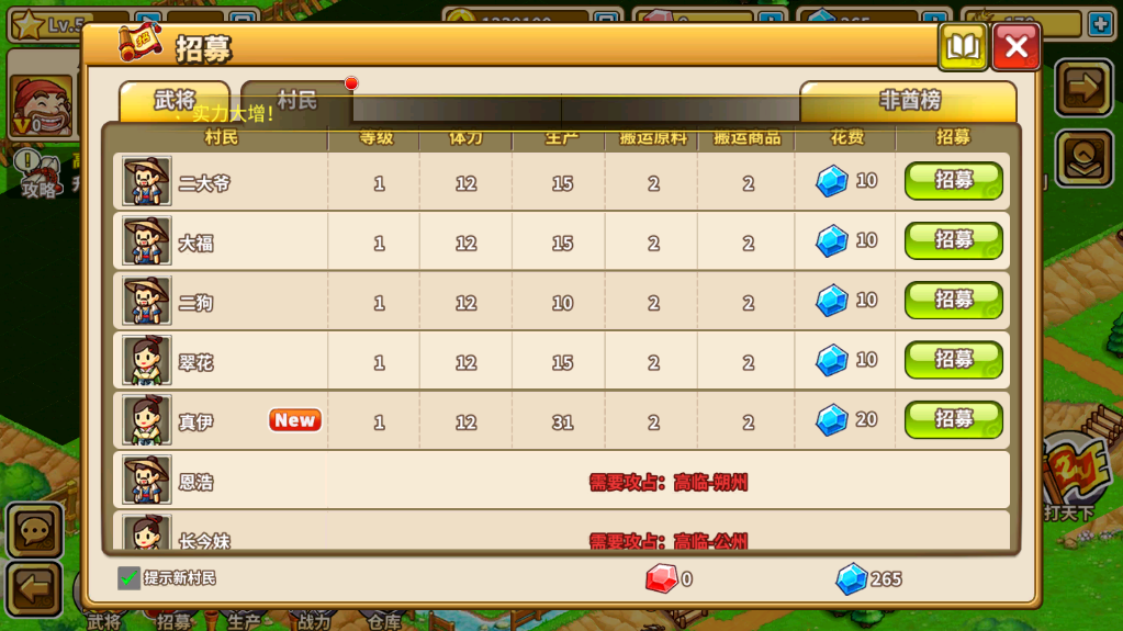在这里,推荐大家使用劳动或劳动成长高的村民,因为劳动是最影响村民工作效率的一个属性。